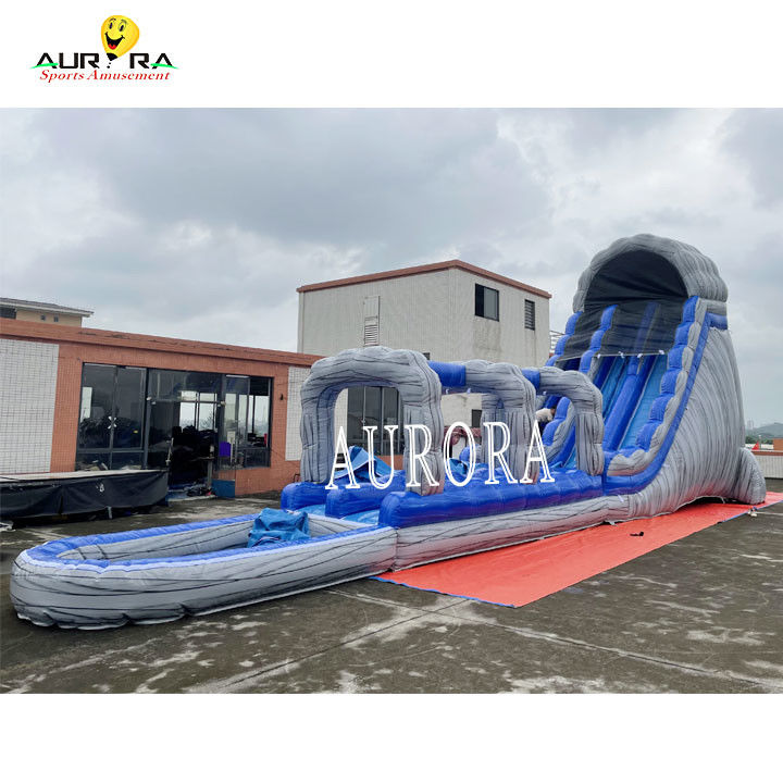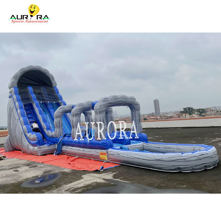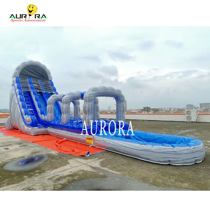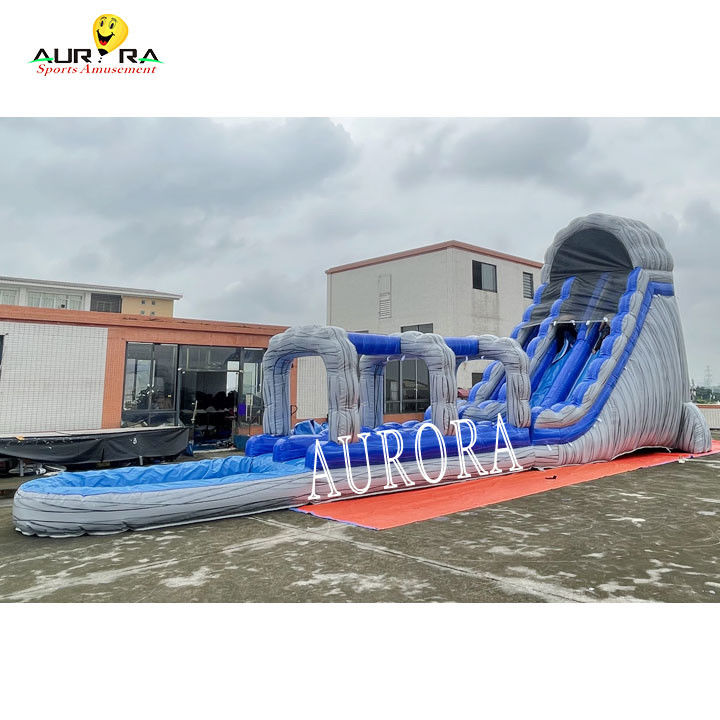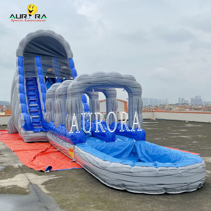 De blauwe opblaasbare glijbaan heeft een modern en minimalistisch grijs als hoofdkleurtoon, aangevuld met lichtblauw als accent, waardoor mensen een modieus en fris gevoel krijgen.